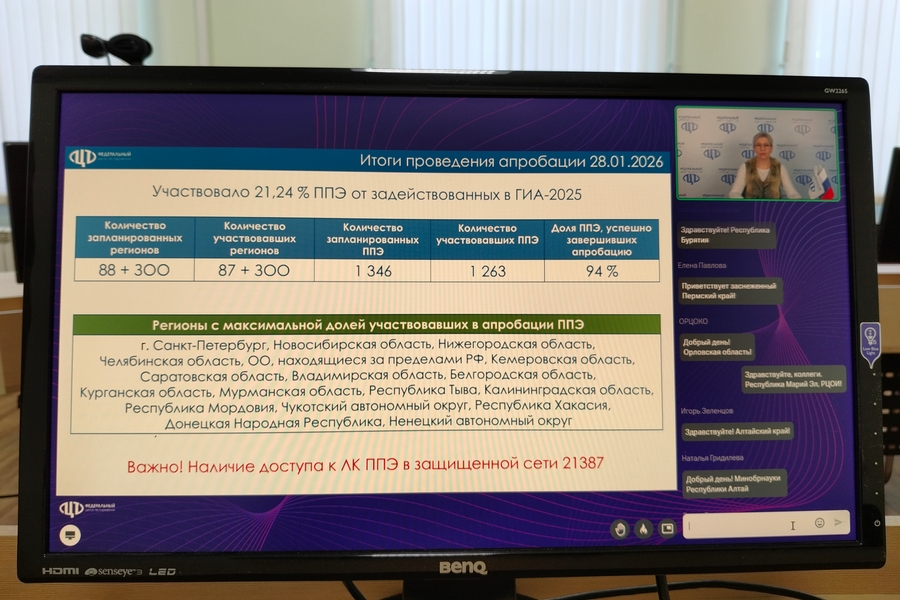 В начале ВКС были кратко представлены итоги первого всероссийского тренировочного мероприятия (ВТМ), проведенного ФЦТ 28 января. В этой апробации участвовало 21,24 % пунктов проведения экзаменов (ППЭ) от общего числа ППЭ, задействованных в ГИА-2026. Доля ППЭ, успешно завершивших апробацию, составила 95 %. Среди них и один пункт-участник ВТМ из нашего региона.