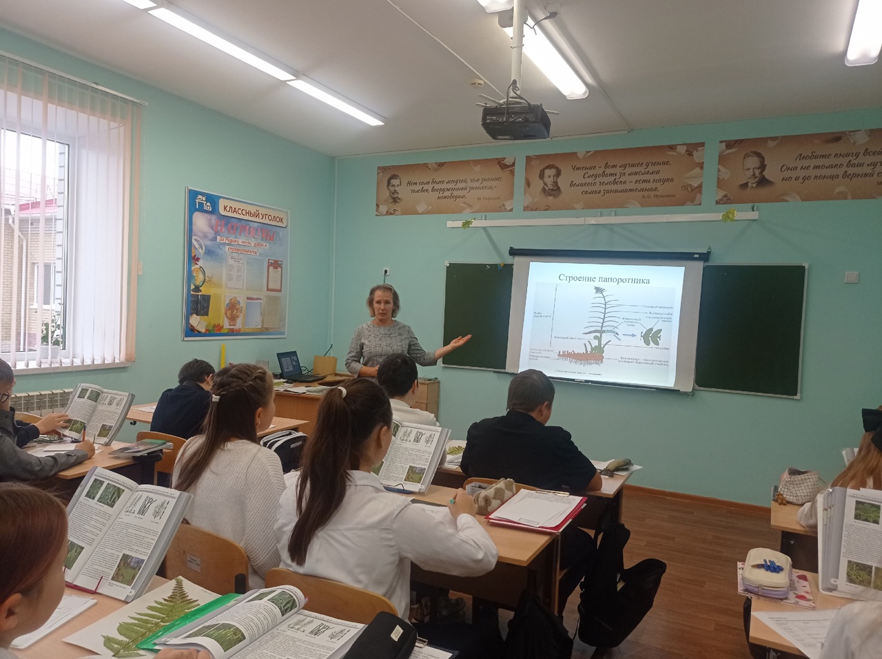 Учитель биологии школы Н.В.Зыкова провела с учащимися 7 класса урок на тему "Особенности строения и жизнедеятельности плаунов, хвощей, папоротников. Практическая работа "Изучение внешнего строения папоротника или хвоща".
