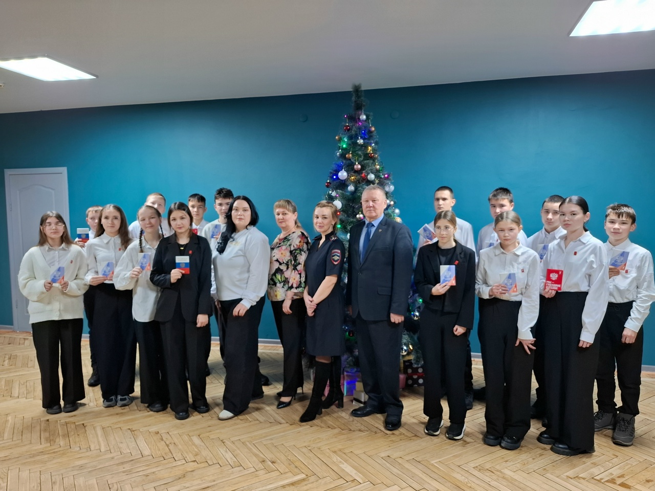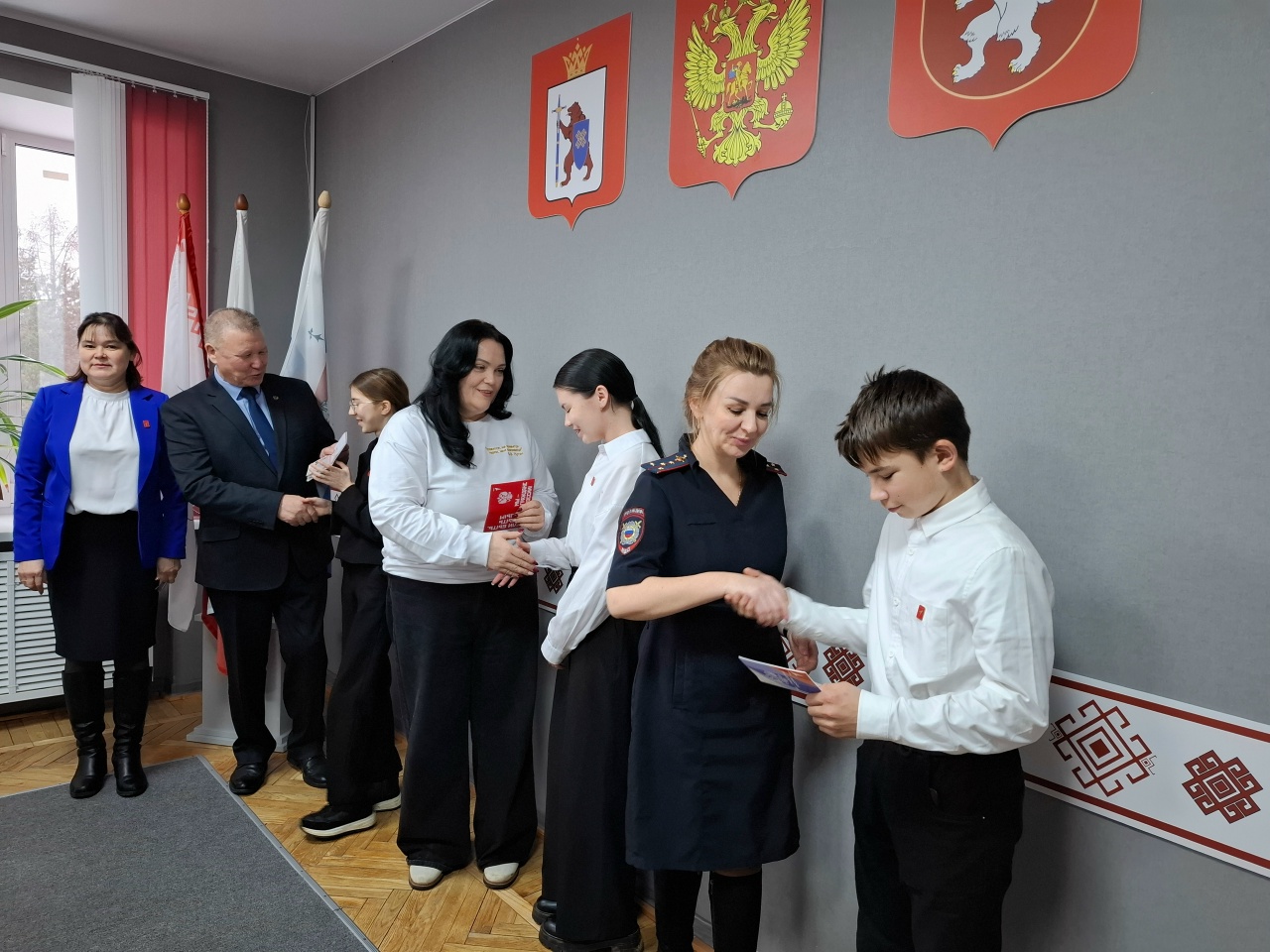 Вместе с паспортами 14‑летним гражданам России были вручены обложки к паспортам и значки «Движения Первых». Руководитель районного отдела ЗАГС Наталья Смиренская подарила календарики на 2026 год с символикой государственной.