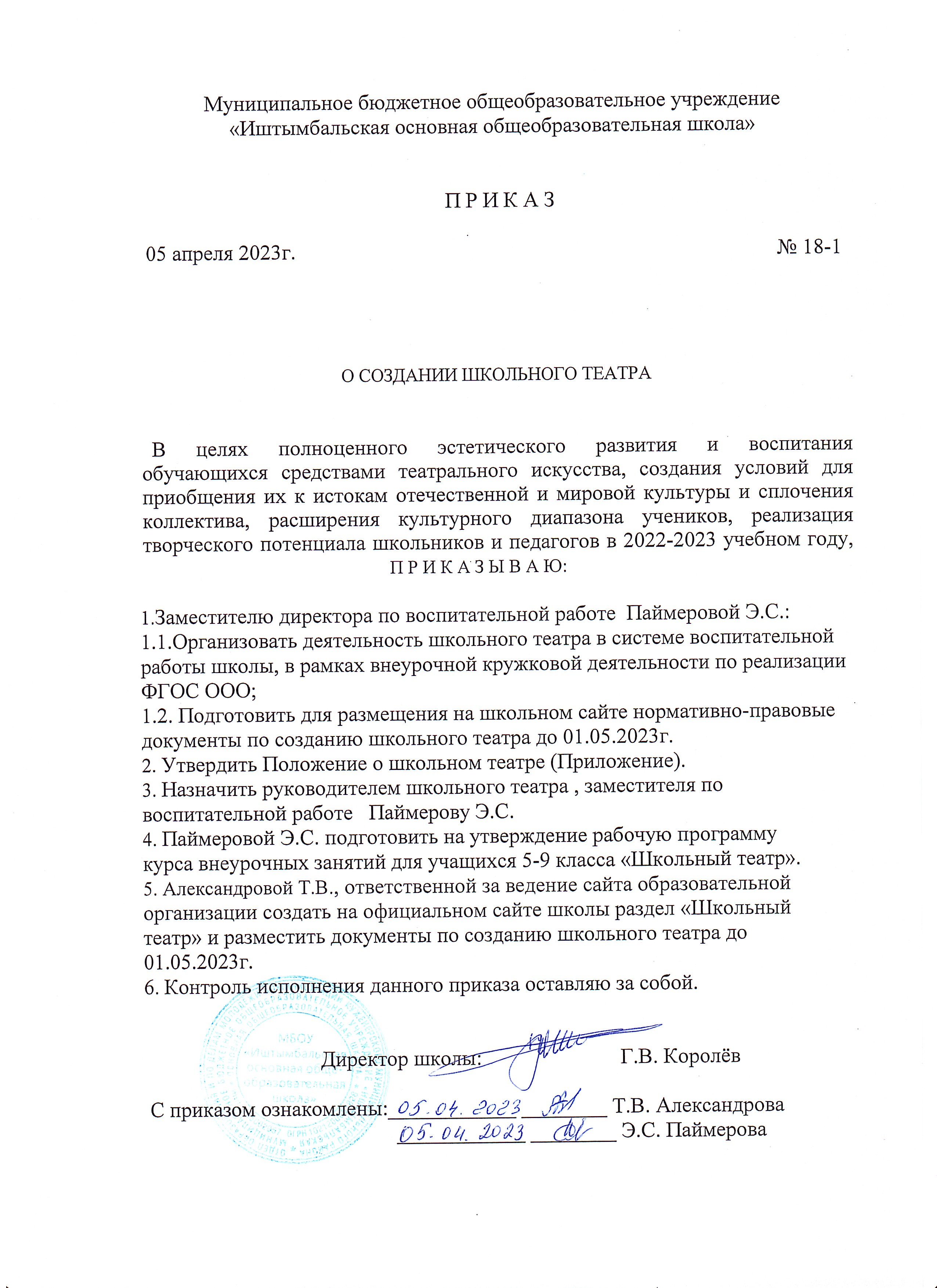 Приказ о создании школьного театраДля открытия меню воспользуйтесь сочетанием клавиш SHIFT+ВВОД (в новом окне).