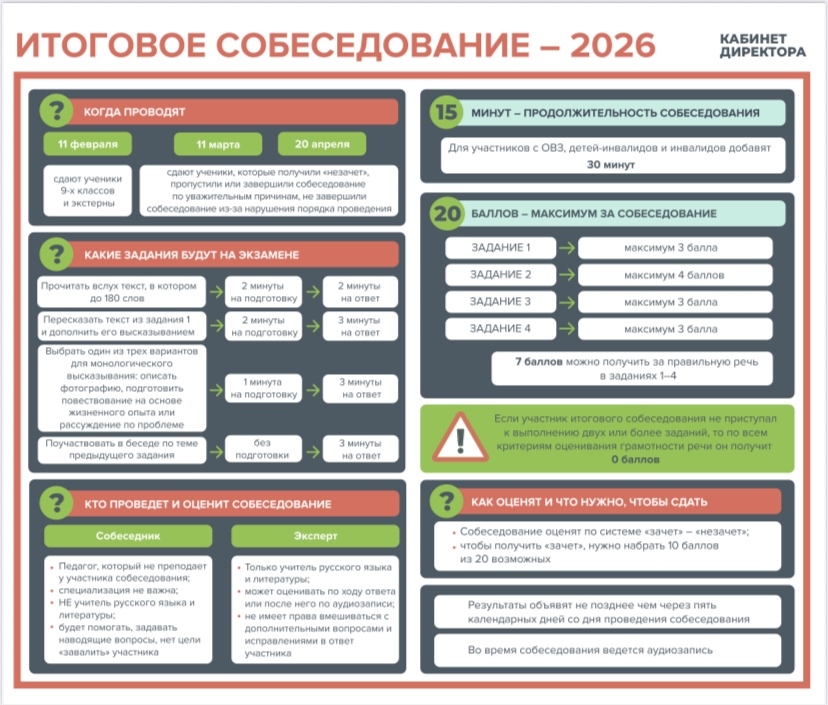 Основной срок проведения итогового собеседования в 2026 году 11 февраля 2026 года. Дополнительные сроки - 11 марта 2026г и 20 апреля 2026г.