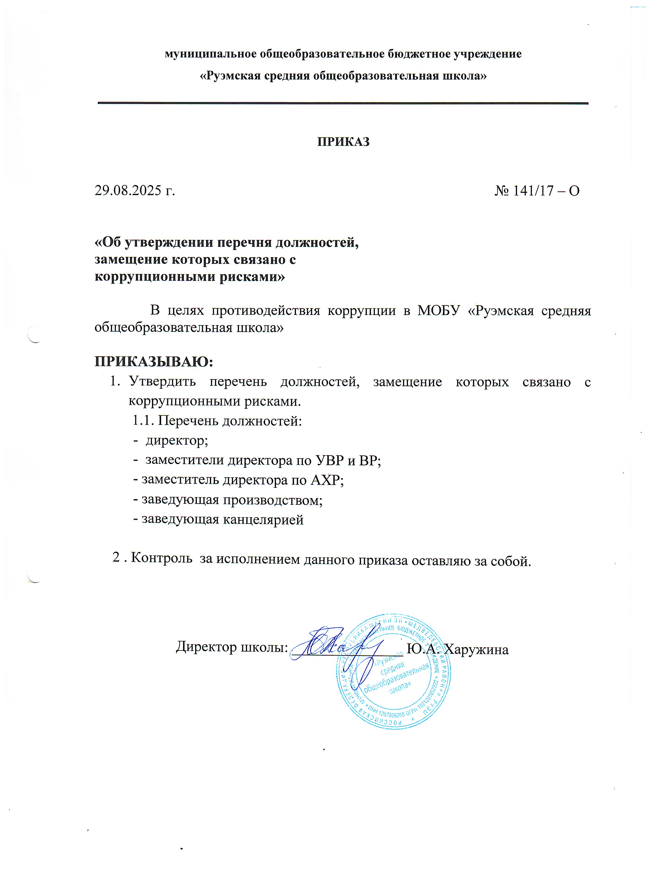 Приказ об утверждении перечня должностей, связанных с коррупционными рискамиДля открытия меню воспользуйтесь сочетанием клавиш SHIFT+ВВОД (в новом окне).