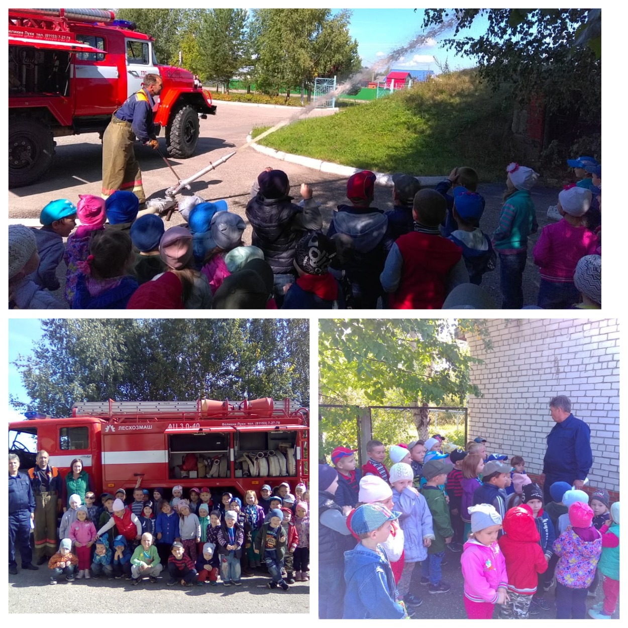 5.09.19 г. в рамках месячника безопасности с детьми детского сада была проведена беседа об играх с огнем, о правилах поведения при пожаре. Пожарные показали работу по тушению огня с помощью водяной пушки. Дали померять детям шлем пожарного.