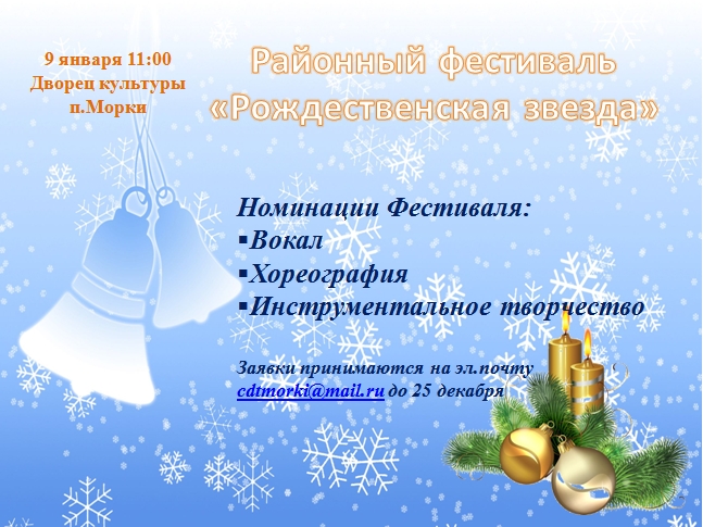 Дорогие друзья!Приглашаем вас принять участие в ежегодном фестивале «Рождественская звезда», посвящённом светлому празднику Рождества Христова!Фестиваль пройдёт в номинациях:ВокалХореографияИнструментальное творчествоПрисоединяйтесь, чтобы наполнить этот праздник радостью творчества, добром и вдохновением!Вместе мы создадим Рождественское настроение и поделимся теплом друг с другом.