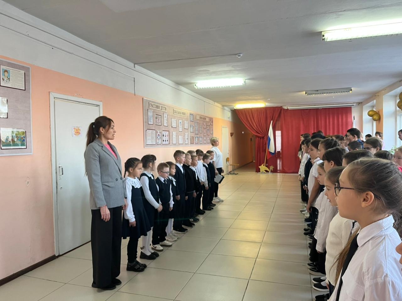 В полной тишине знаменная группа школы совершила внос Государственного флага РФ, обучающиеся 1 класса исполнили государственный Гимн Российской Федерации.