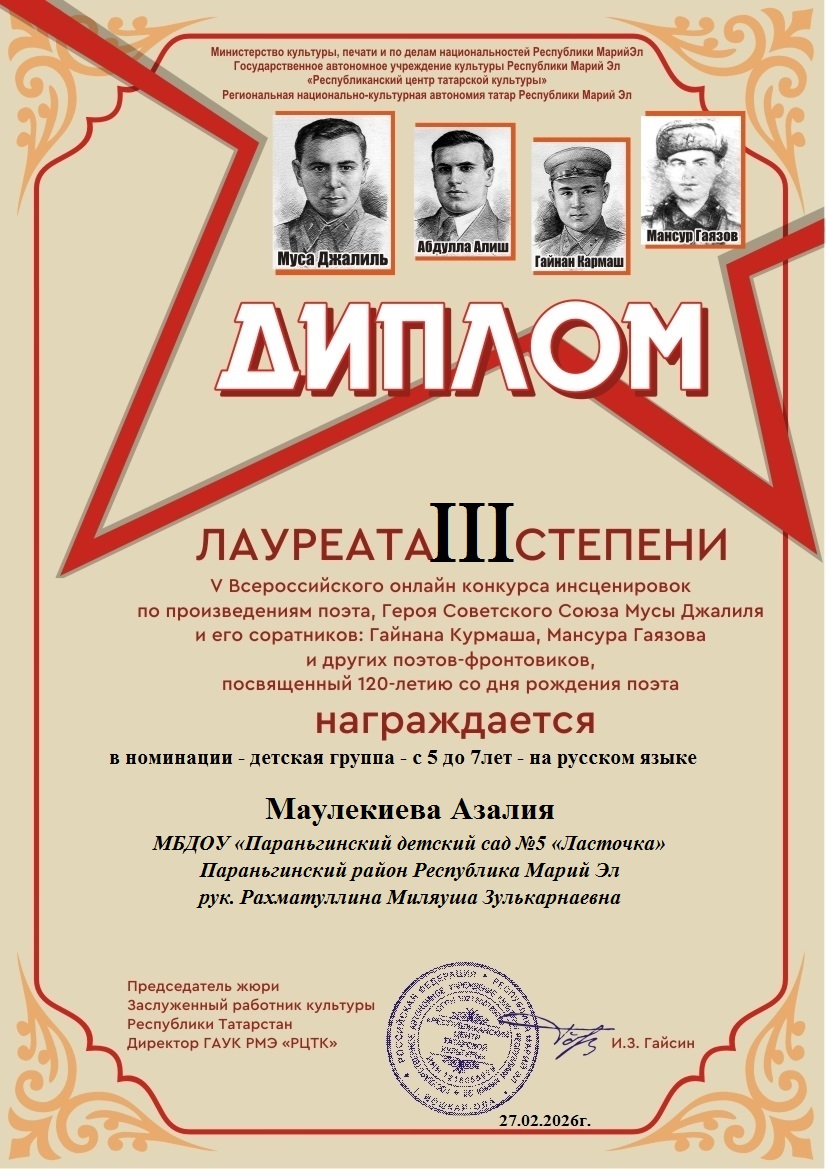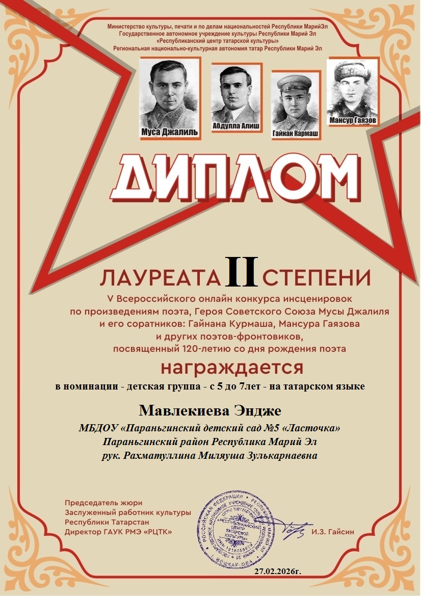 Мавликиева Эндже лауреат 2 степениДля открытия меню воспользуйтесь сочетанием клавиш SHIFT+ВВОД (в новом окне).Создать