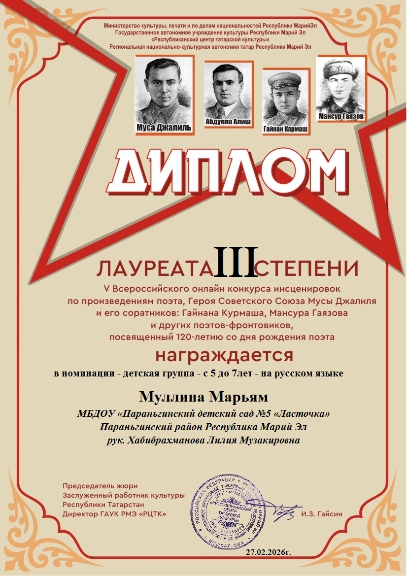 Муллина Марьям лауреат 3 степениДля открытия меню воспользуйтесь сочетанием клавиш SHIFT+ВВОД (в новом окне).Создать