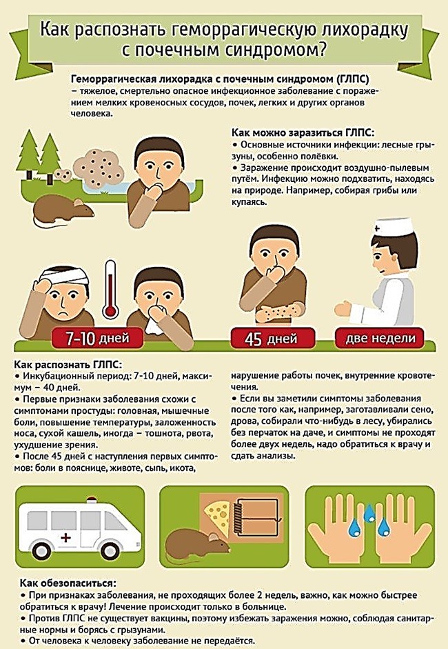 Как уберечься от вируса ГПЛС? Весна, лето, осень - это дачный сезон, когда возрастает большая вероятность подхватить опасное заболевание - геморрагическую лихорадку с почечным синдромом. В народе эту болезнь называют мышиной лихорадкой. Грызуны могут заразить организм человека опасной инфекцией. Мышиная лихорадка – как раз такой пример, который на начальных стадиях трудно определить даже специалисту. У больного появляются острые признаки ОРЗ, такие как повышенная температура, ухудшение состояния почек, интоксикация организма и внутрисосудистые свертывания в виде сгустков. Повышенному риску подвергаются люди, проживающие в сельской местности, которые находятся по близости с лесом. Как можно заразиться геморрагической лихорадкой с почечным синдромом Механизм передачи мышиной лихорадки основан на распространении вируса от животного к человеку. При этом грызуны являются только носителями, но не испытывают на себе симптомы болезни. Между людьми вирус не передается. Специалистам известно несколько путей, как заразиться мышиной лихорадкой: • Воздушно-пылевой – происходит вдыхание человеком мелких частичек мышиных фекалий. • Контактный – вирус попадает в небольшие повреждения на коже при соприкосновении с инфицированными предметами. • Алиментарный – человек употребляет воду или пищу, которые заражены мышиными экскрементами. Инкубационный период После того как пациент получил заражение, первые признаки болезни могут проявиться через 4-46 дней. В среднем инкубационный период мышиной лихорадки составляет около 1 месяца. Во время этой стадии вирус в организме человека начинает размножаться, распространяясь на большие территории. Накопление патогенных клеток лихорадки происходит в тканях различных органов и лимфоузлах. Симптомы мышиной лихорадки у детей • высокая температура тела (до 40 градусов); • сильные боли в мышцах, суставах; • частая тошнота, рвота; • нарушение зрения; • озноб, общая слабость; • мигрени; • обильные кровотечения из носа, десен. Профилактика геморрагической лихорадкой с почечным синдромом Снизить риск заражения вирусом поможет профилактика мышиной лихорадки. Поскольку передается недуг исключительно от животных, следует постараться избегать контакта с ними и продуктами их жизнедеятельности: • сделайте пищу и воду недоступными для проникновения грызунов; • перед каждой трапезой тщательно мойте руки; • если продукты повреждены мышами, ни в коем случае не употребляйте их; • проводите термическую обработку употребляемой пищи; • избегайте посещения мест скопления грызунов; • проверяйте жилые и нежилые помещения на наличие грызунов, если места их пребывания обнаружены, ликвидируйте их; • проводите дератизацию (комплексные меры по уничтожению грызунов).