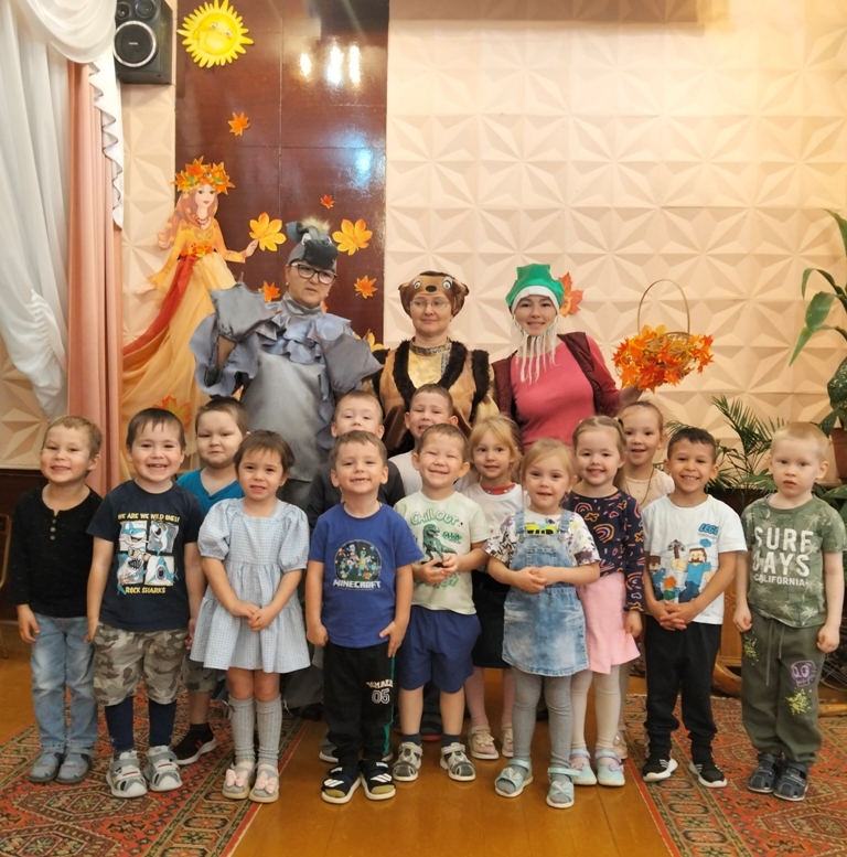 Дети средней группы отправились в путешествие по осеннему лесу, где их встретил Гном, красавица Осень, а так же лесные звери: Волк и Мишка. Дети пели песни, отгадывали загадки, играли на музыкальных инструментах, участвовали в небольших соревнованиях.