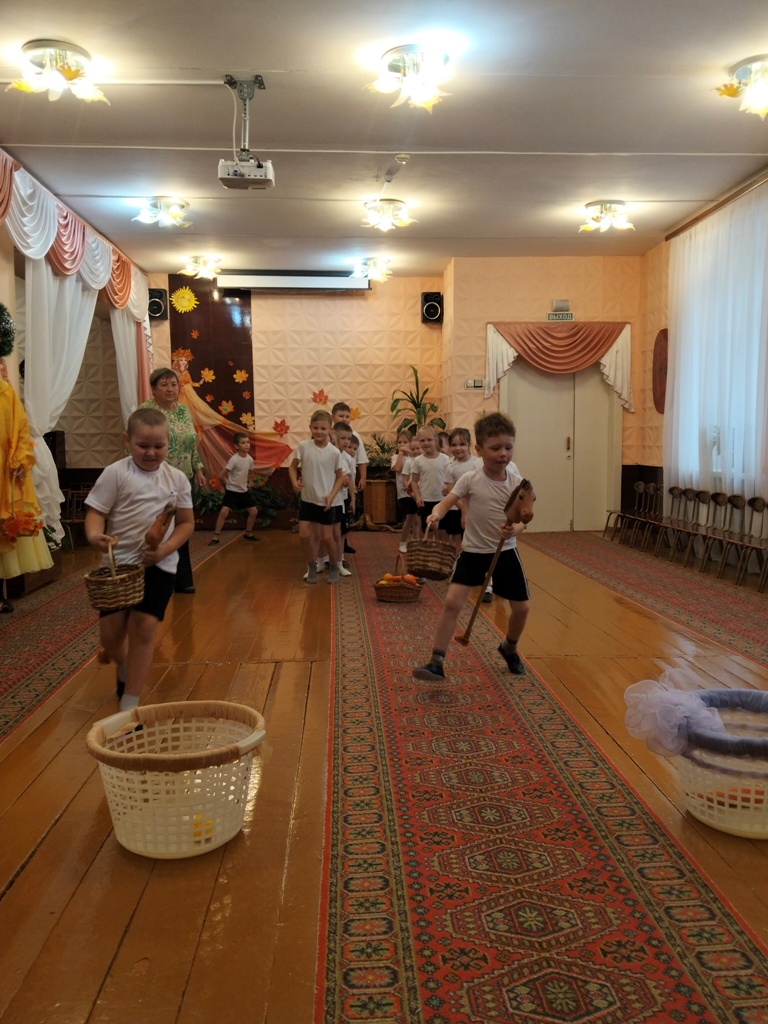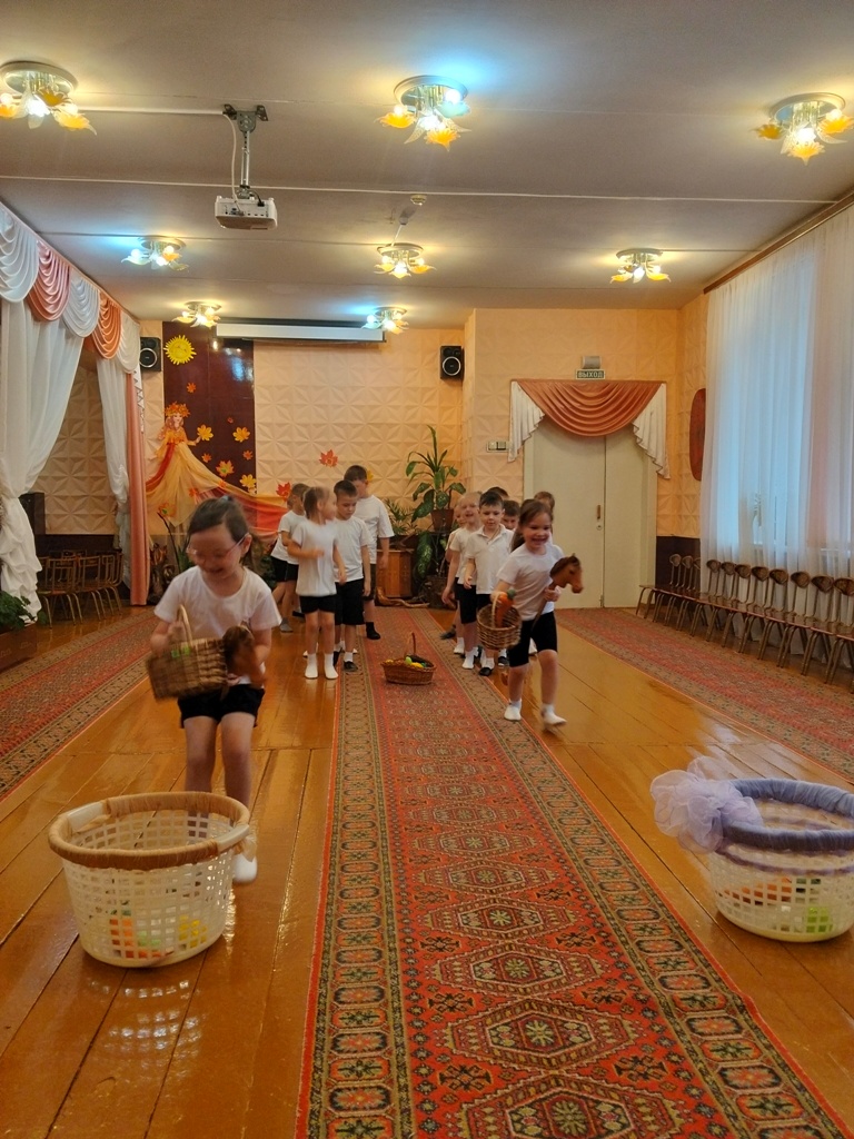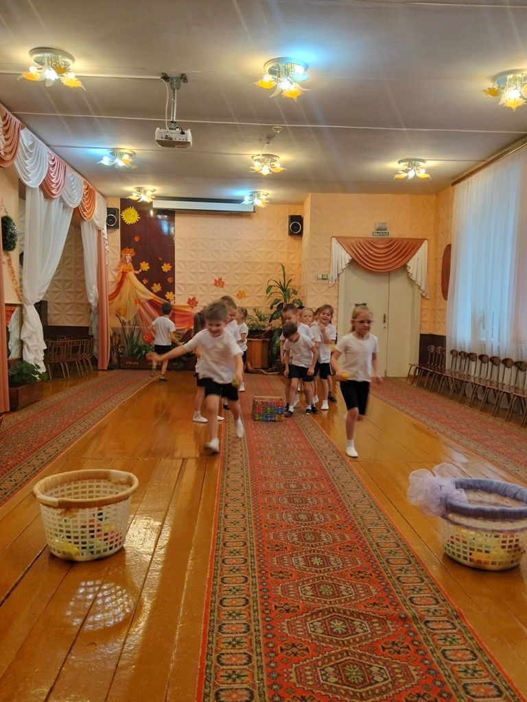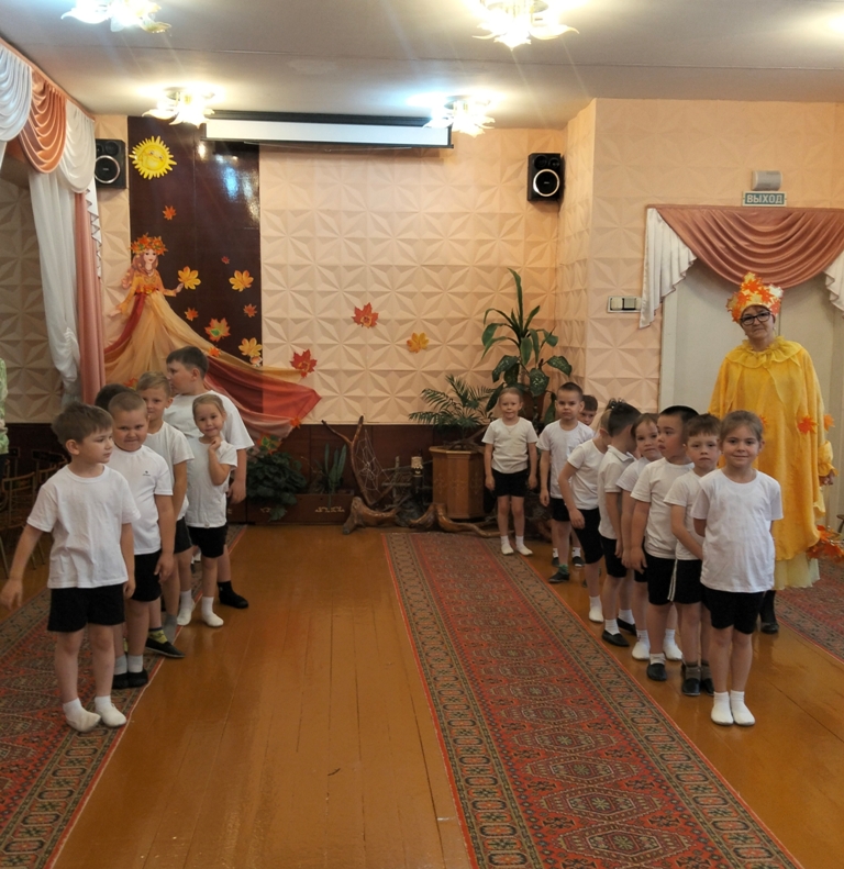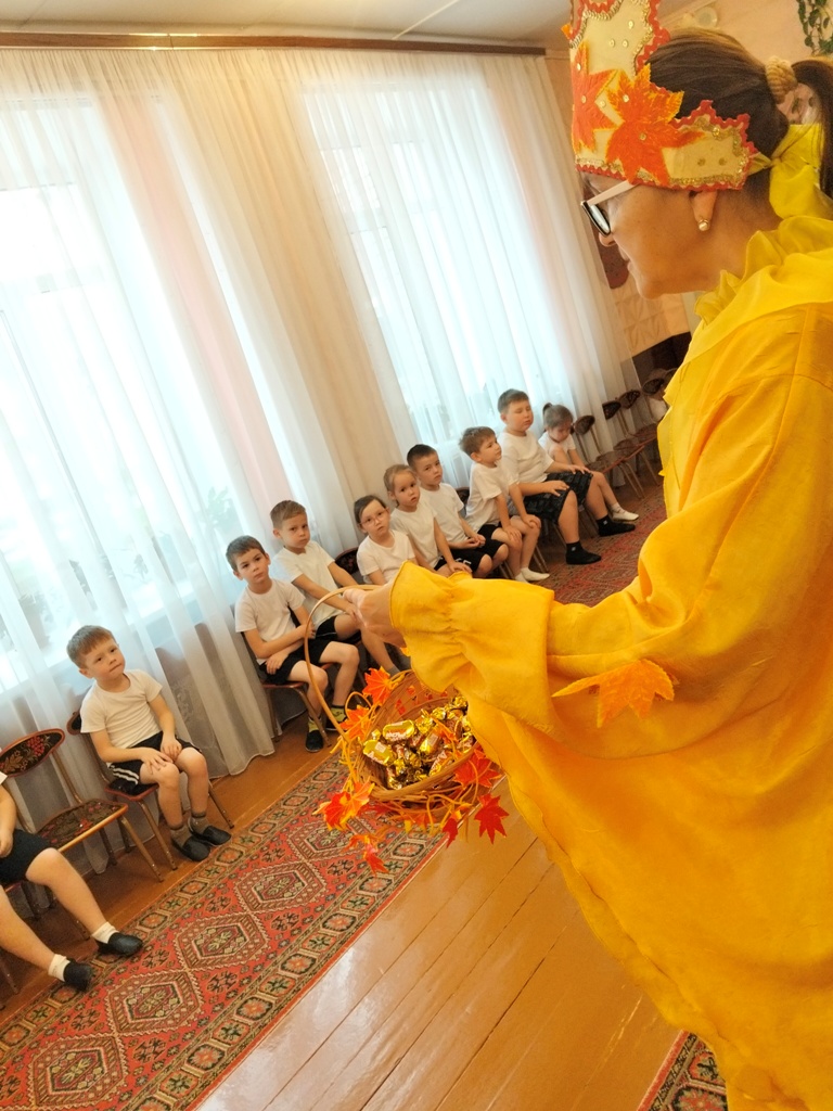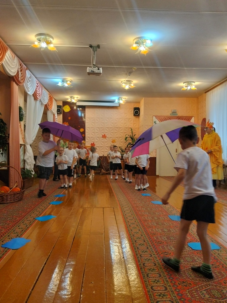 К ребятам подготовительной и компенсирующей групп пришла в гости Осенинка, которая предложила провести осенние соревнования. Соревновались друг с другом две команды: «Листочки» и «Грибочки». Дети отгадывали загадки, играли в веселые осенние игры.