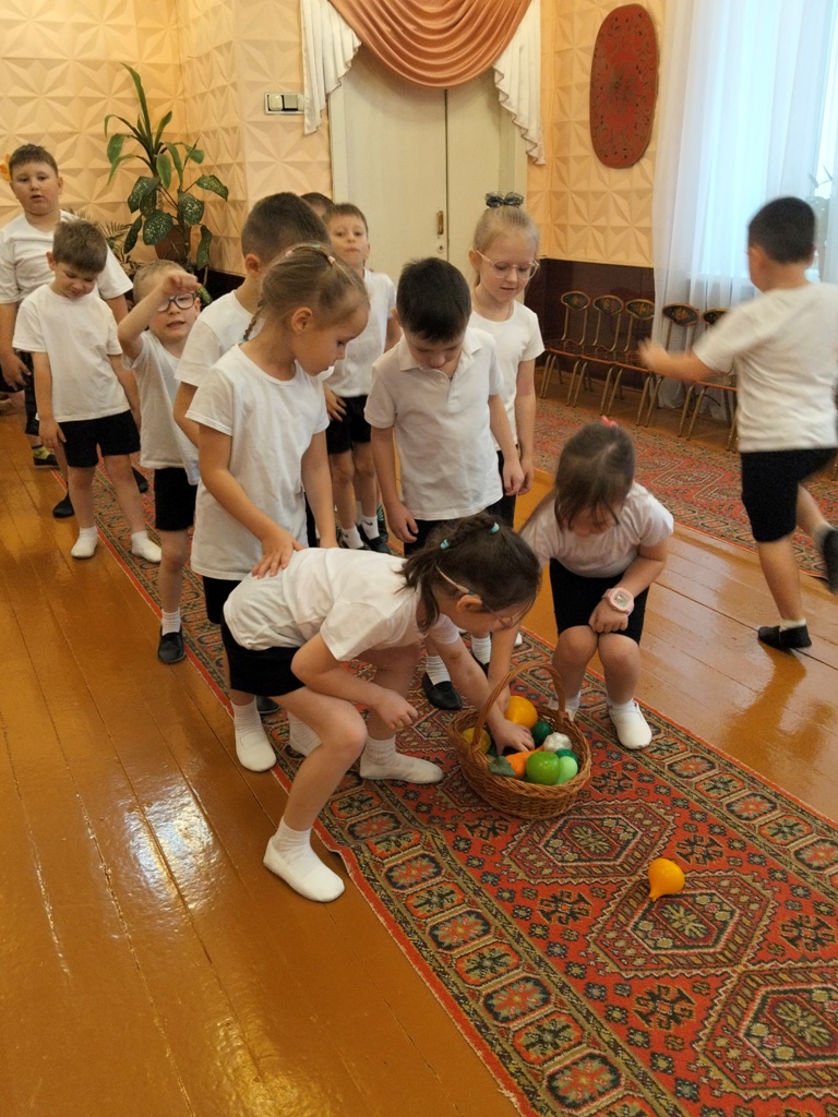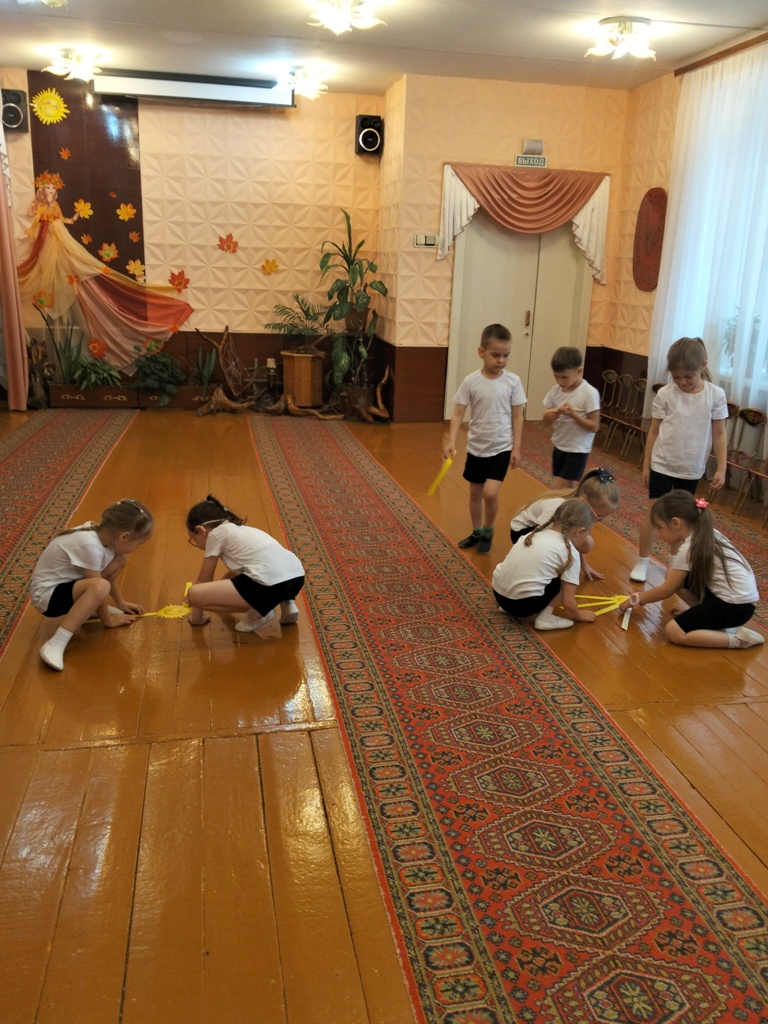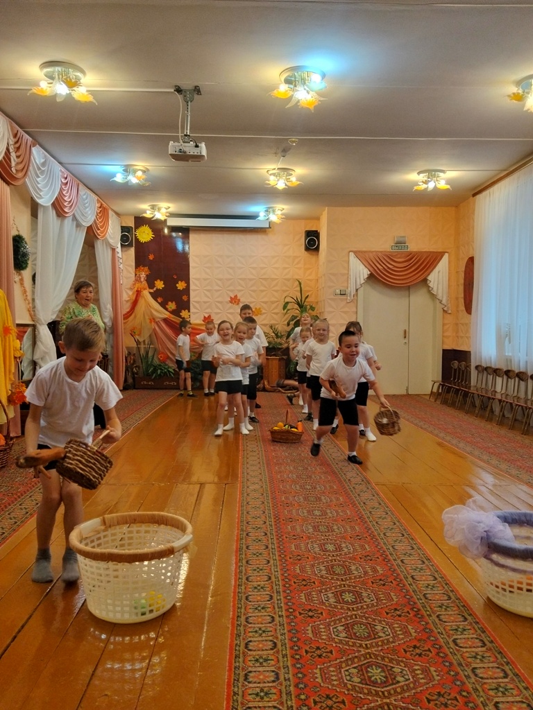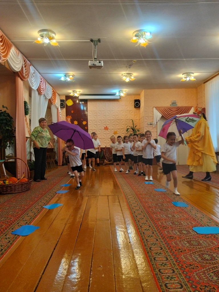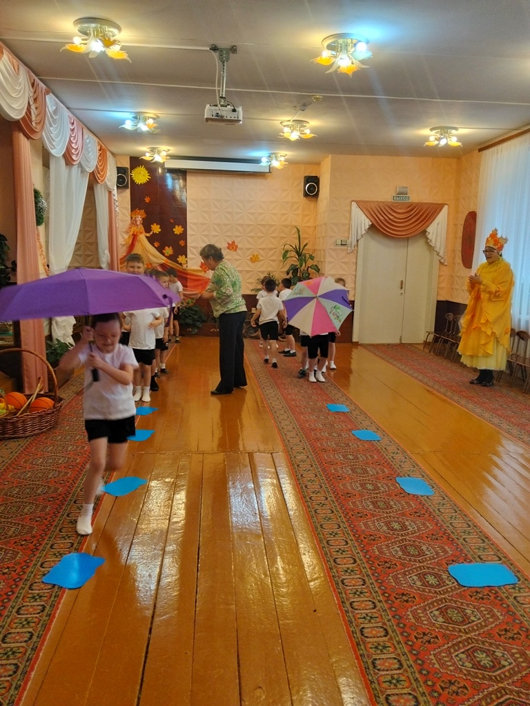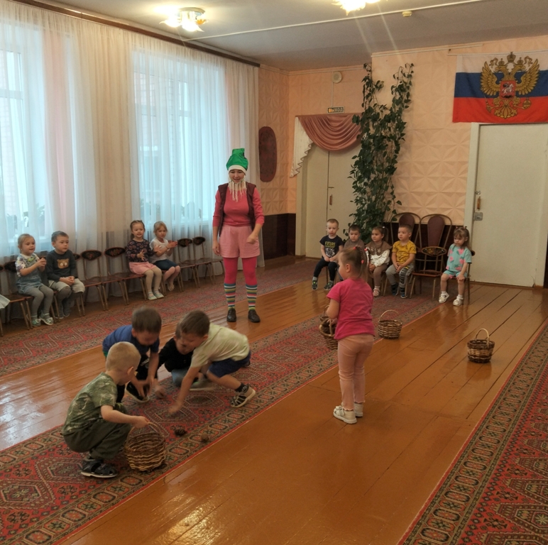 К ребятам подготовительной и компенсирующей групп пришла в гости Осенинка, которая предложила провести осенние соревнования. Соревновались друг с другом две команды: «Листочки» и «Грибочки». Дети отгадывали загадки, играли в веселые осенние игры.