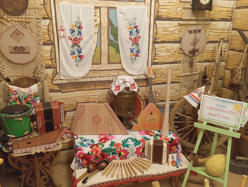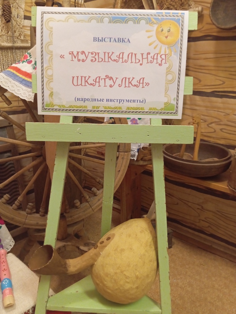 В настоящее время для наших воспитанников организована выставка «Музыкальная шкатулка», благодаря которой посетители знакомятся с народными музыкальными инструментами. Это и национальные марийские инструменты – тотрет пуч, шувыр, кусле, тумыр. Дети с удовольствием узнают знакомые народные музыкальные инструменты: балалайку, гармошку, дудочки, трещетку и даже расписные деревянные ложки.