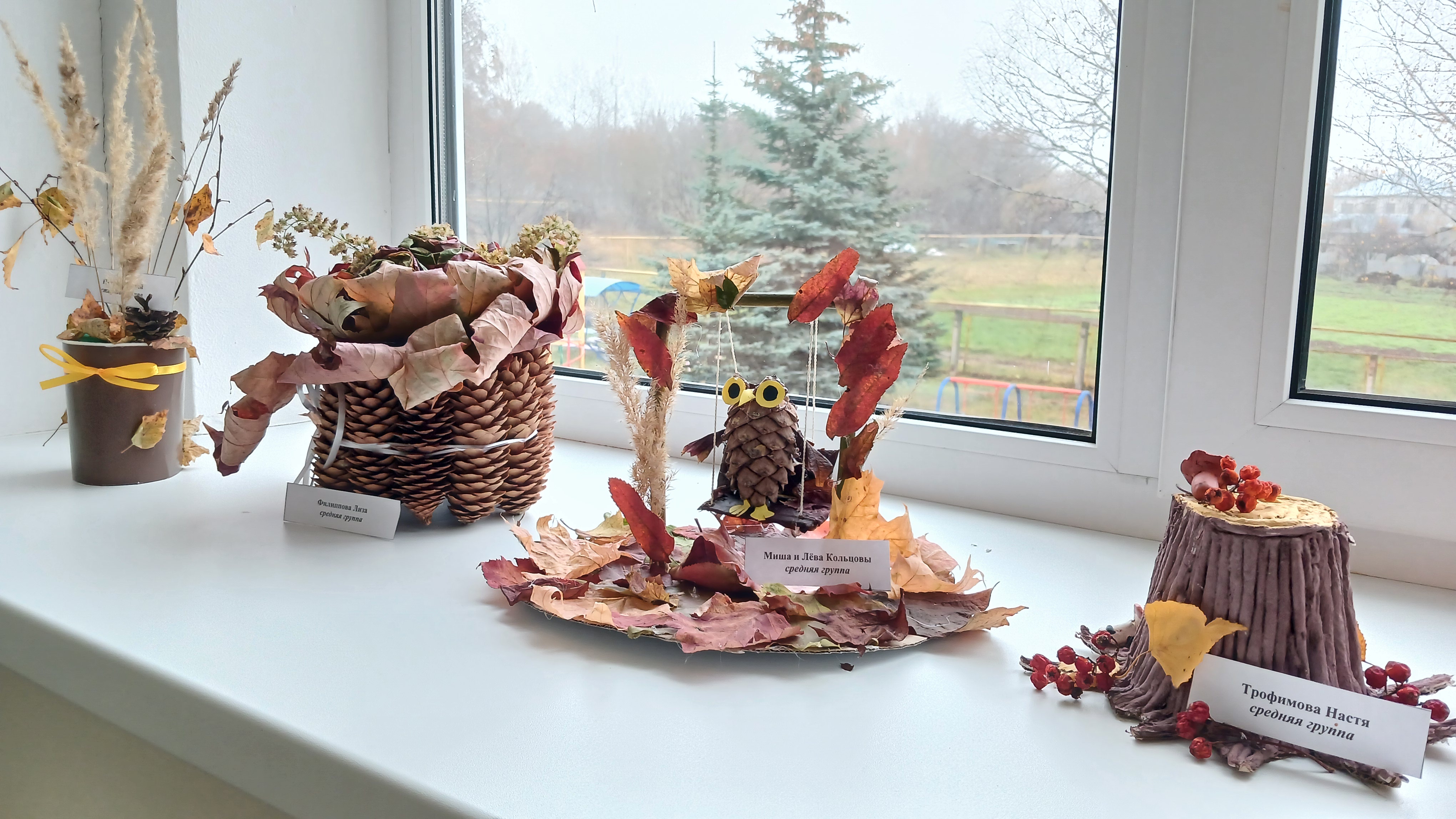 В нашем детском саду с большим успехом прошла выставка осенних поделок на тему «Осень золотая в гости к нам пришла», в которой приняли участие дети и родители всех возрастных групп. В своих работах ребята использовали разные природные материалы – шишки, листья, цветы, веточки, мох, ягоды и т.д. На выставке были представлены лесные композиции, осенние сказки, игровые ситуации, панно, игрушки и многое другое. Участие семей в конкурсах поделок из природного материала обогащает семейный досуг, и объединяет детей и взрослых в общих делах. В результате у детей воспитывается трудолюбие, аккуратность, уважение к труду. Это начало патриотического воспитания, любви к родному краю, окружающей нас природе. К работе участники выставки отнеслись серьёзно и вложили много фантазии, терпения, труда, и поэтому все достойны высшей похвалы!
