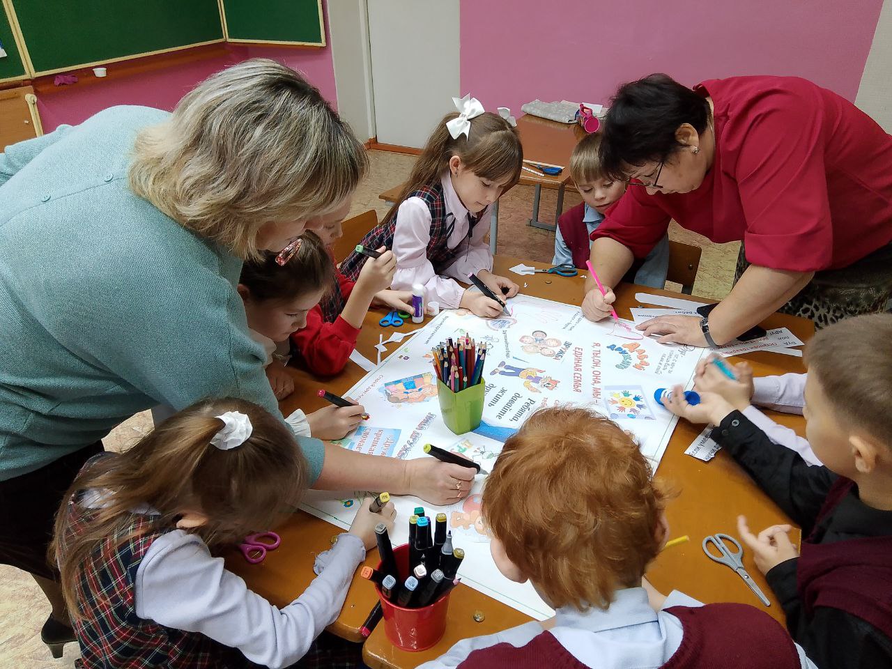 В начальном звене провели игровое занятие с элементом тренинга. Итогом было создание коллажа «Давайте жить дружно!», где развивали навыки общения, работы в коллективе; совершенствовали и развивали творческие способности, фантазию. Учителями начальных классов после просмотра мультфильмов «Ах и Ох», «Просто так», «Подарок для самого слабого» организована беседа, которые направлены на воспитание общечеловеческих ценностей: доброты, отзывчивости, понимания и уважения к окружающим людям.