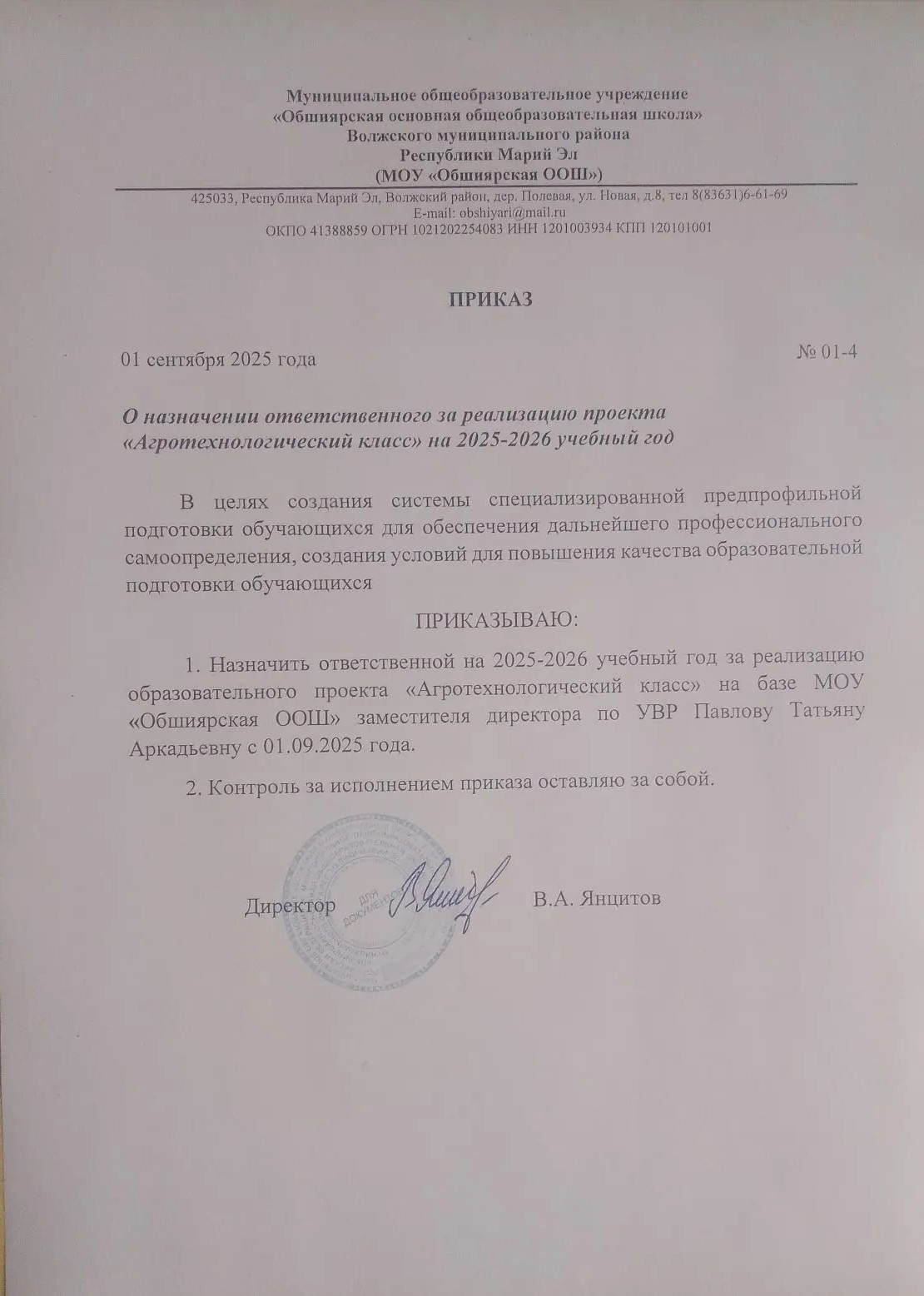 Приказ о назначении отвественного за реализацию проекта Агротехнический класс.jpg