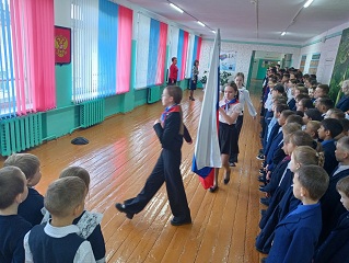 Новая учебная неделя в нашей школе традиционно началась с торжественного вноса флага и исполнения гимна Российской Федерации.Право внести флаг РФ была удостоена знаменная группа школы в составе: Истаковой Е., Трофимовой К., Петуховой Е.
