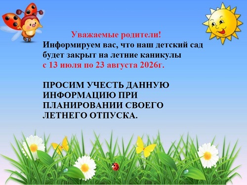 В соответствии с приказом Управления образования городского округа "Город Йошкар-Ола" № 321 от 11.11.2025 наш детский сад будет закрыт на летние каникулы с 13.07.2026 по 23.08.2026г.