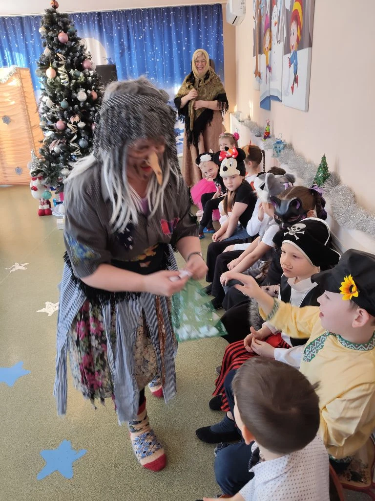 Ребята подготовительных групп «Крыжовник», «Малинка», «Брусничка» в ряженых костюмах колядовали, танцевали, играли в забавные игры, а сказочные персонажи одаривали детей сладостями и пожеланиями счастья.