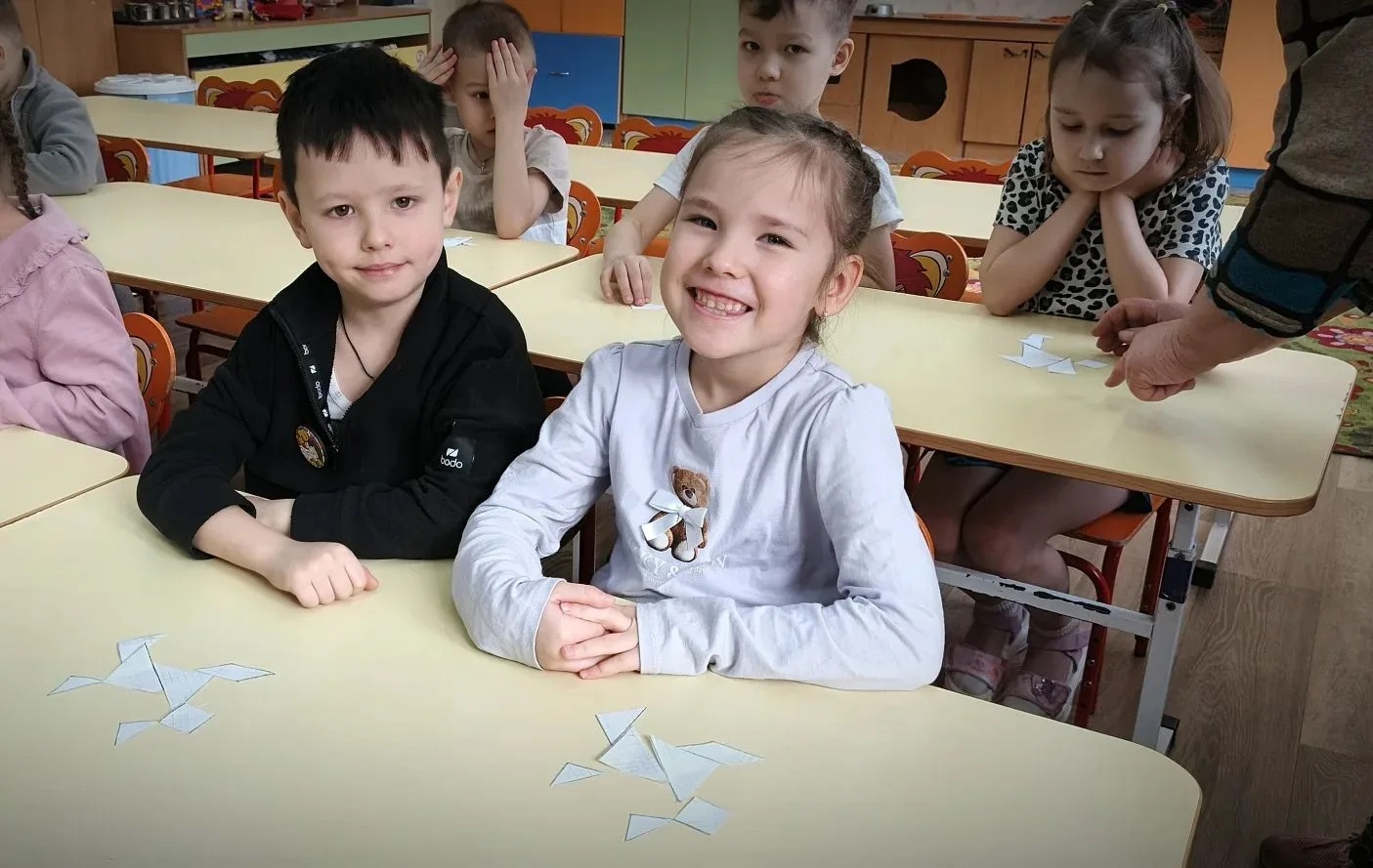 Педагог дополнительного образования из ДОЦ "Азимут" Людмила Викторовна напомнила сегодня ребятам уже знакомую им игру Танграм. Рассказала, что игра - головоломка появилась в Китае в древние времена и до сих пор не утратила своей популярности. Дети узнали, что в переводе с китайского языка слово танграм обозначает «семь дощечек мастерства», научились изготавливать игру самостоятельно, а затем делили целый объект на части и составляли из него изображения по образцу. Танграм – замечательная тренировка для ума, которая помогла весело провести время и закрепить полезные навыки.