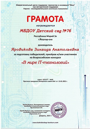 Грамота за подготовку победителей на Всероссийском конкурсе "В мире IT-технологий", 2021 год |