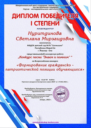 Диплом победителя I степени на Всероссийском конкурсе "Формирование гражданско-патриотической позиции обучающихся", 2022 год |