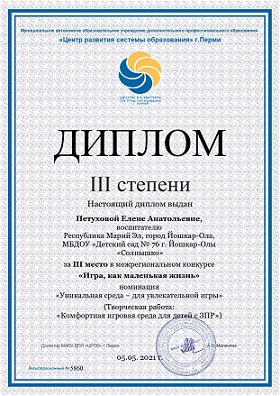 | Диплом за III место в межрегиональном конкурсе "Игра, как маленькая жизнь", 2021 год |