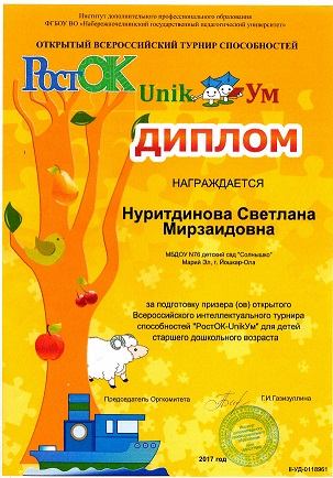 Диплом за подготовку призера открытого интеллектуального турнира способностей "РостОК-UnikУм" для детей старшего дошкольного возраста, 2019 год |