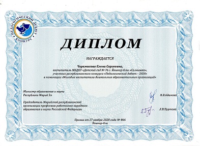 Диплом участника республиканского конкурса "Педагогический дебют - 2020" в номинации "Молодые воспитатели дошкольных образовательных организаций", 2020 год |