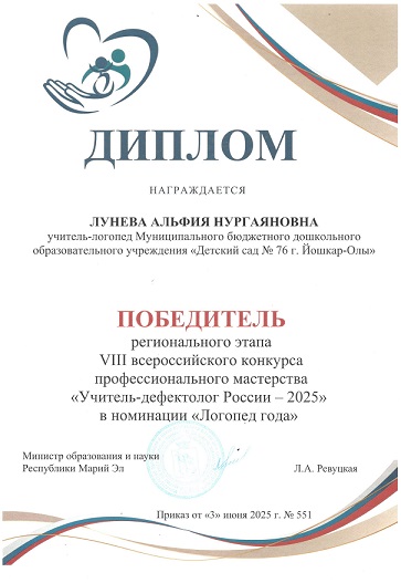 | Диплом победителя регионального этапа VIII всероссийского конкурса профессионального мастерства "Учитель-дефектолог России - 2025" в номинации "Логопед года", 2025 год |