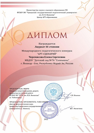 | Диплом Лауреата III степени Международного педагогического конкурса "АРТ-СЦЕНАРИЙ", 2022 год |