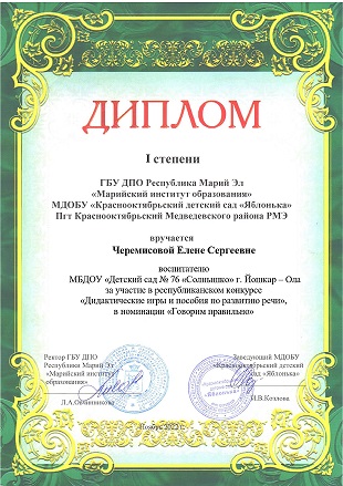 | Диплом I степени за участие в республиканском конкурсе "Дидиактические игры и пособия по развитию речи", 2022 год |