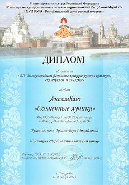 Диплом об участии в III Международном фестивале-конкурсе русской культуры "Корнями в России", 2017 год |