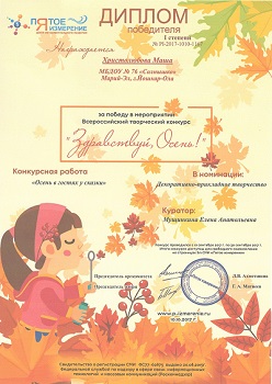 Диплом победителя 1 степени во Всероссийском творческом конкурсе "Здравствуй, Осень", 2017 год |