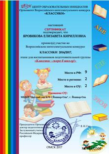 Сертификат участника Всероссийского интеллектуального конкурса для подготовительных групп «Классики – скоро в школу», 2017 год |