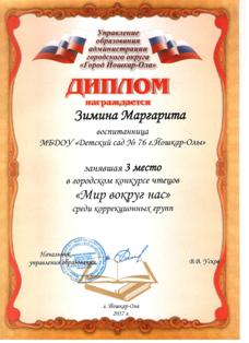 Диплом за 3 место в городском конкурсе чтецов "Мир вокруг нас" среди логопунктов, 2017 год |