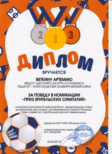 Диплом за победу в номинации "Приз зрительский симпатий" в конкурсе рисунков "Я люблю футбол", 2017 год |