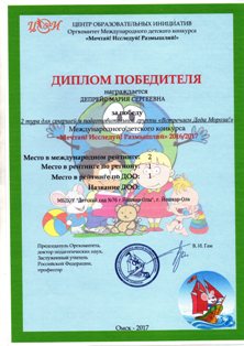 Диплом победителя 2 тура для старших и подготовительных групп «Встречаем Деда Мороза!» международного детского конкурса «Мечтай! Исследуй! Размышляй!», 2017 год |
