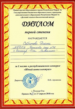 Диплом за I место в Республиканском конкурсе "Юный интеллектуал", 2018 год |