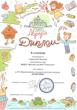 | Диплом за 1 место в XIV Всероссийском конкурсе детского рисунка "Букетики", 2023 год |