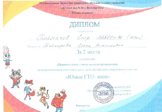 Диплом за 2 место в состязаниях "Юные ГТО-шки" в дисциплине прыжок в длину с метра двумя ногами, 2024 год |