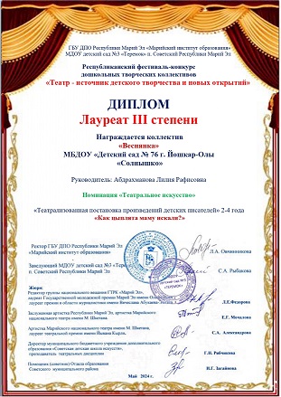 | Диплом лауреата III степени в республиканском фестиваль-конкурсе дошкольных творческих коллективов "Театр - источник детского творчестваи новых открытий", 2024 год |