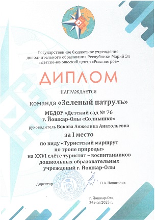 Диплом за I место по виду "Туристский маршрут по тропе природы" XXVI стета туристят - воспитанников дошкольных образовательных учреждений г. Йошкар-Олы, 2025 год |