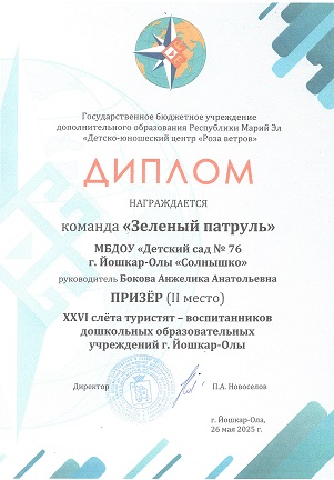 | Диплом за II место XXVI стета туристят - воспитанников дошкольных образовательных учреждений г. Йошкар-Олы, 2025 год |