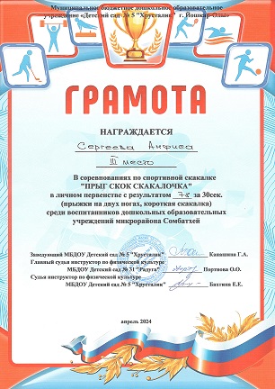 Грамота за III место в соревнованиях по спортивной скакалке "ПРЫГ СКОК СКАКАЛОЧКА", 2024 год |