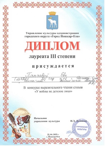Диплом лауреата III степени в конкурсе выразительного чтения стихов "У войны не детское лицо", 2025 год |