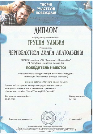 | Диплом победителя Всероссийского конкурса "Твори! Участвуй! Побеждай!", 2025 год |