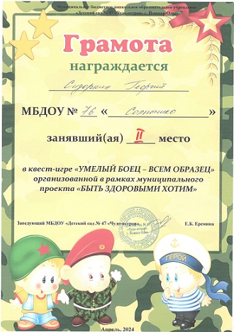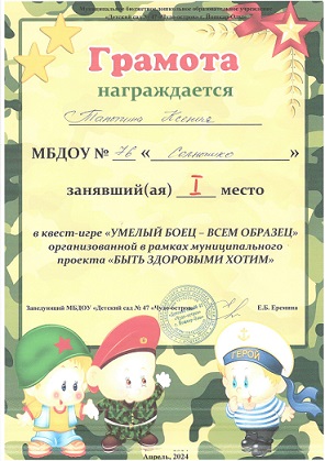 Грамота за 1 место в квест-игре "Умелый боец - всем образец", 2024 год |