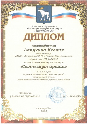 | Диплом за III место в городском конкурсе чтецов "Сылнымут аршаш", 2024 год |