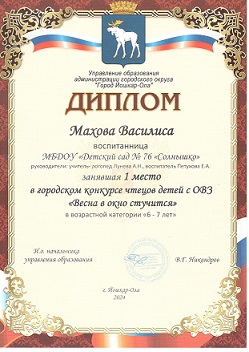 | Диплом за 1 место в городском конкурсе чтецов "Весна в окно стучится", 2024 год |