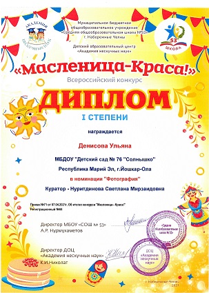 Диплом I степени за участие во Всероссийском конкурсе "Масленица - Краса", 2021 год |